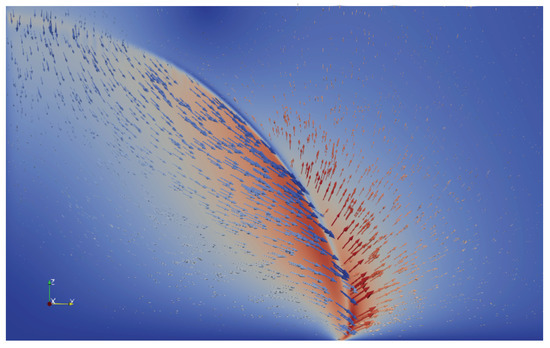 Velocity vectors from the cross section of a 3D simulation. Vectors are scaled by magnitude and colored by vertical component, with blue denoting downward velocity and red upward velocity. The background is colored by velocity magnitude, with blue denoting zero and red denoting high velocity. Strong downward motions are seen within the fluid mound (left), while strong updrafts are seen in the air being displaced by the advancing front (center right). The midpoint along the arc length of the interface is characterized by a nearly stagnant zone, where velocity changes from negative at left to positive at right with respect to the interface outward normal vector.