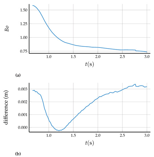 (a) Bond number calculated at the height of undercut for the surface tension case. (b) Difference between the surface tension and baseline cases. Bond number and differences from simulations presented in Figure 4. The lack of correlation between and the difference occurs as velocity builds from the initial condition.