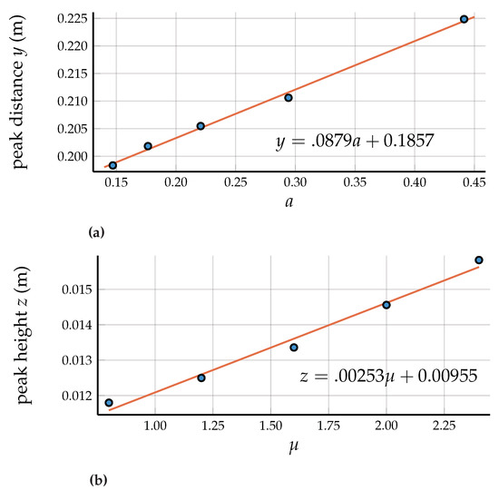 (a) A strong linear relationship is observed between the peak distance y and the parameter a, with a standard error of 0.0031 m. (b) Peak undercut height as a function of . Standard error for the linear fit is 0.0018 m. Both are measured from the baseline case when no modeled interface effects are present.