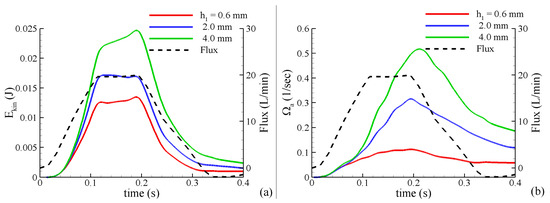 (5) The kinetic energy of the blood flow: where is determined by direct integration over the aorta’s volume. represents a portion of the mechanical energy in the system, which is exchanged with pressure and the viscous dissipation terms. In the absence of additional energy added to the system, an increase in kinetic energy will be accompanied by a decrease in pressure and an increase in energy dissipation.