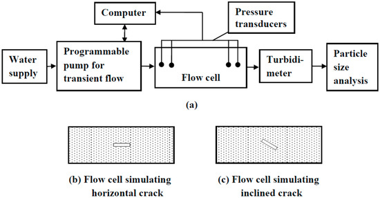 Schematic of flow cells for estimation of model parameters associated with (a) dislodgement of particles in the upstream part, (b) erodibility of crack walls, and (c) particle entrapment capacity of soil in the downstream side of crack.