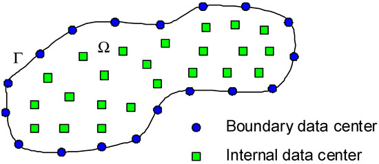 The meshless formulation begins by defining a domain, Ω, which is circumscribed by boundary, Γ, as depicted in Figure 3. A finite set of data centers, NC, are defined and is comprised of NB points on the boundary, and NI interior points within the domain. All the NC data centers will serve as collocation points for the localized expansion of the field variables in the domain. The only difference between boundary data centers and internal data centers is simply that boundary conditions are applied to the former while governing equations are applied to the latter.