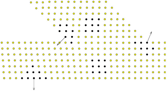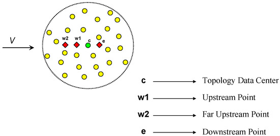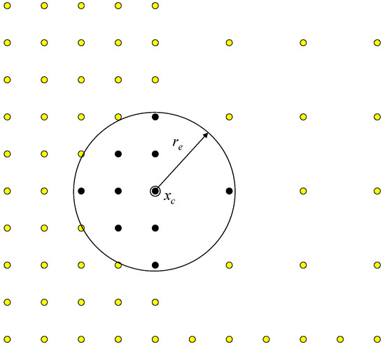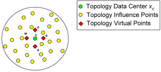 This can be written in matrix-vector form, allowing the evaluation of the field variable derivatives at each of the data centers, , to be found by a simple inner product of two small vectors: which can be pre-built and stored and which is the updated field variable distribution in the topology of the data center. The derivation of the vector, , is given in the Appendix A in Equations (A1)–(A5).