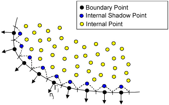 where, is the distance from the boundary data center to its corresponding shadow point in the domain. Notice that all elements of the interpolation vector except two vanish. This shadow layer approach also allows the implementation of higher-order derivatives by simply including additional shadow layers in the normal direction of the boundary data center.