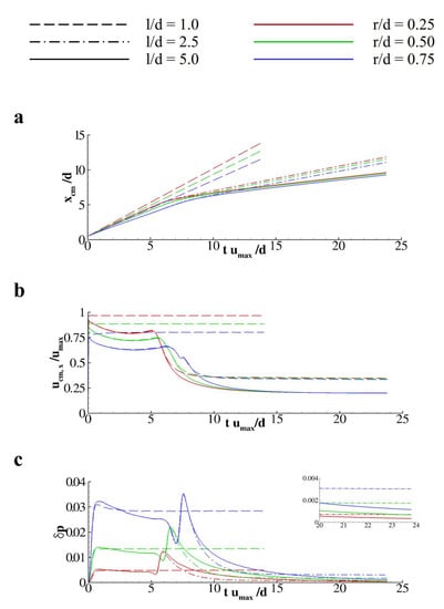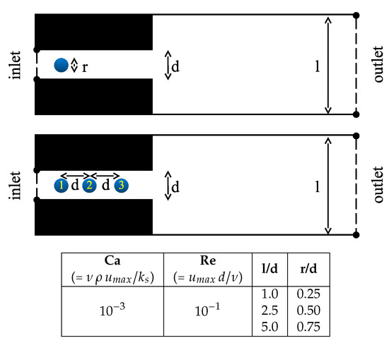 In order to span a meaningful parameter space, a combination of different configurations was investigated. The capsules were varied to have different sizes, namely 0.25, 0.50 and 0.75, where r is the capsule diameter and d is the narrow channel diameter. Three configurations of channel geometries were investigated, namely 1.0, 2.5 and 5.0, where l is the diameter of the reservoir. Additionally, three different configurations: no capsule, a single capsule, and three in-line capsules, were simulated and investigated. The Capillary number and Reynolds numbers were chosen to be and .