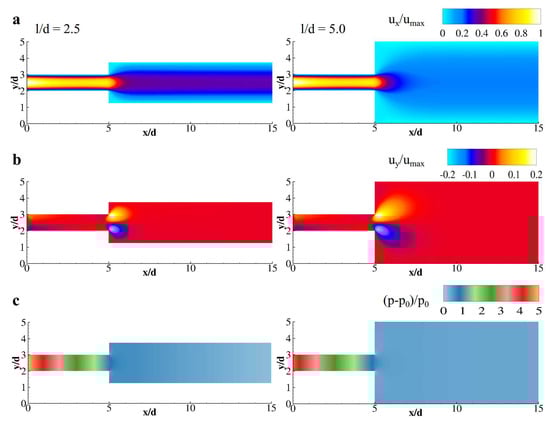 Flow patterns for different width of the reservoir. (a) contour of the longitudinal component of the velocity field for 2.5 (left) and 5.0 (right); (b) contour of the vertical component of the velocity field for 2.5 (left) and 5.0 (right); (c) relative pressure distribution in the computational flow field ( is the outlet section pressure). Data for 1.0 are shown in Appendix A.