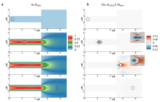 Flow patterns during the transport of a single capsule in the micro-channel. (a) contour of the longitudinal velocity field for 5.0 and 0.50 taken at four different time steps, namely 0, 5, 10, and 20; (b) contour plot of difference between the longitudinal velocity with () and without () the capsule immersed in at four different time steps, namely 0, 5, 10, and 20.