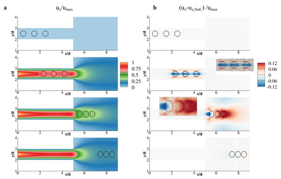 Flow patterns during the transport of three aligned capsules in the micro-channel. (a) contour of the longitudinal velocity field for 5.0 and 0.50 taken at four different time steps, namely 0, 5, 10, and 20; (b) contour plot of difference between the longitudinal velocity with () and without () the capsules immersed in at four different time steps, namely 0, 5, 10, and 20.