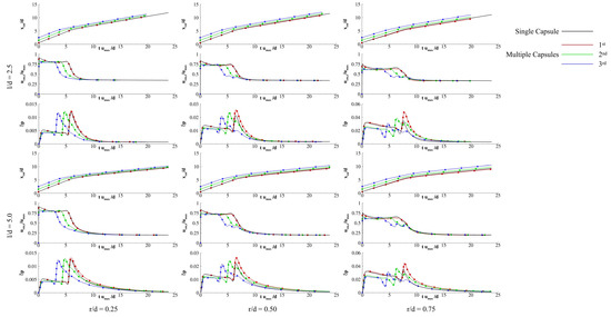 In Figure 6, the properties of the single capsule (also shown in Figure 4) and of the multiple particles are plotted as function of normalised time. We notice that the effect of the relative reservoir diameter, , does not play a noticeable influence beyond a given size. Additionally, we observe a greater effect of the multiple capsules when they are larger, and therefore focus our presentation of results for the set-up and . The discussion is amenable to the other set-up cases, and differences are presented. In general, for the smaller capsules with 0.50 and 0.25 the same phenomena are present as for the larger capsules, but to a lesser extent. Indeed, for the smallest capsules , the effect of the multiple cells is almost imperceivable. The reason for this is a reduced inter-capsule interaction, due to the relatively large capsule separation distance and the small capsule size that will not significantly affect the flow field.