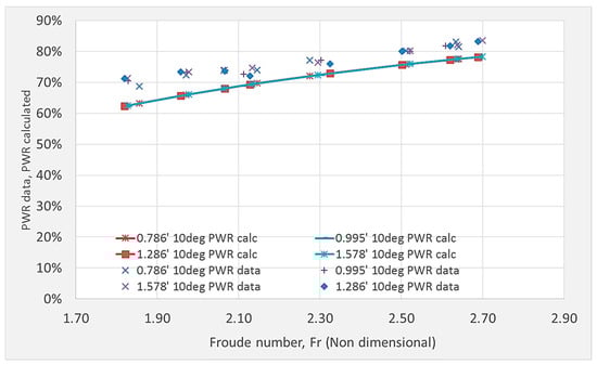 The increase in the pitch angle was accomplished by rotating the 0° bulb, having the upper part of the bulb-pier intersection as a fixed point. The introduction of the pitch angle corrected the spraying problem and increased the PWR for the bulb with the same upper horizontal length (Figure 11). The results also showed that an increase in the pitch angle reduced the PLbb by eliminating the flow over the bulb (Figure 12).