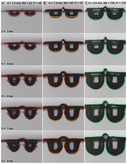 Different mesh sizes were evaluated to analyze the mesh independence of the solution, which, for fine details, is always an issue when using the VOF technique. Mesh sizes were varied between 176 kcell and 12.35 Mcell, but meshes under 1 Mcell proved unsuitable because the already mentioned neck between the craters also disappeared (resulting in a coalescence of the cavities not observed in the experiments) for cases A and B. Thus, only the finest two meshes (1.4 Mcell and 12.35 Mcell) were used for the final simulations. For the latter, a good overall mesh independence was found, even if some details are still captured differently. No mesh is always the most accurate (as can be seen in Figure 2 and Figure 3 for case B).