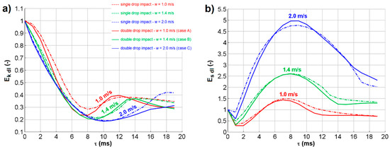 For both kinetic and surface energy, the values extracted from the numerical results at the time step immediately before impact were compared with the theoretical predictions for drops of known diameters and velocities to check their correctness and reliability. The average deviation was 0.78% for kinetic energy and 1.31% for surface energy, which was considered satisfactory. Figure 8 shows the results for both the double drop impacts and the corresponding (i.e., with same impact velocity) single drop impact, after normalization of the values with respect to the kinetic energy and the surface energy immediately before the impact. The time evolution of the two energy contributions appears consistent with the experimentally observed behavior and with each other. When kinetic energy increases, surface energy decreases, and vice versa. Surface energy decreases during the first instants after impact because the drop coalesces with the pool (so a part of the drop and the pool’s external surfaces are merged, with a consequent reduction in the total interface area), but the crater is not formed yet. The profiles also show a very regular evolution for impact velocity. The most interesting outcome is that the evolutions for single and double impacts are extremely similar, even if minor differences are obviously present due to the more complex evolution of the crater shape in double drop cases (e.g., causing the mutual intersections between the curves). This suggests that the latter has only a minor influence on energy conversion during the crater’s expansion and recession.