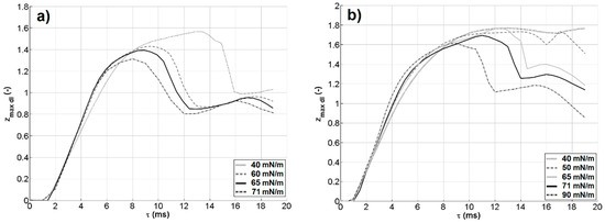 Time evolution of zmax dl as a function of the water surface tension for case A (w = 1.0 m/s, (a)) and for case B (w = 1.4 m/s, (b)).