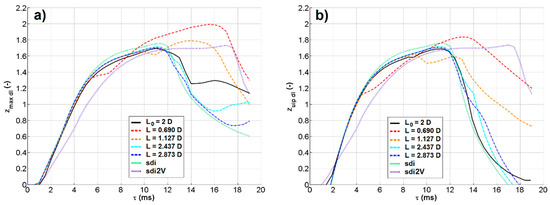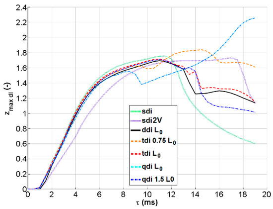 In terms of the characteristic dimensions of the drop craters, the crater’s maximum penetration depth zmax, the maximum crater penetration depth in the transverse plane including the impact point zc (i.e., parallel to the yz-plane and at a x-coordinate equal to half of the drop interspace [10]), and the crater penetration depth along the vertical line including the impact point zuip, were measured from both the experiments and the simulations. In this work, these quantities are always presented in a dimensionless form, by dividing them by the drop diameter before impact. Therefore, their symbols are completed by a “dl” subscript in all the following charts. For double drop impacts, these quantities do not always coincide during the crater evolution (differently from what happens for single drop impacts). This can be clearly seen, e.g., in Figure 2 and Figure 3. zmax and zc are accessible both to experiments and simulations, while zuip can be evaluated only by simulation because its measurement requires a cross-section of the craters (along the xy plane) and not just a side view. Figure 6 and Figure 7 show the values of these quantities for case A (w = 1.0 m/s) and case B (w = 1.4 m/s) as a function of time. As for all the charts in this paper, the initial time τ = 0 was fixed at the instant of impact. In the experimental results, the two craters are not perfectly equal, but their difference is very slight (as can be seen for zmax for case B in Figure 7). Therefore, only the values for the left crater are shown in Figure 6. More specifically, Figure 6 reports the results for case A (w = 1.0 m/s), comparing simulations and experiments for the two values of the water–air surface tension set in the simulations.