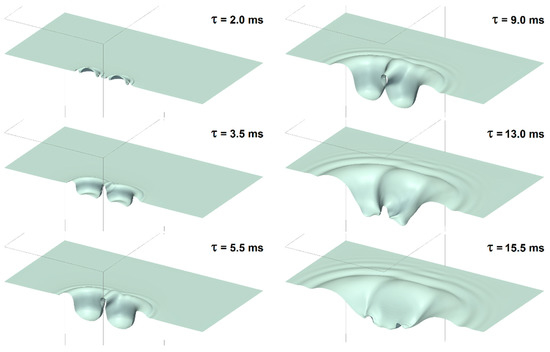 For case B in Figure 5, the generation of the outer vortex structure is superposed, and the dyed liquid spreads around the cavity. The interaction between the two evolving craters causes a local enlargement of the spreading dyed drop liquid, showing a vortical structure in both investigations (the experiment and simulation (τ = 8 ms)). When the cavities recede, apparently disorganized structures separate and move downward. The numerical results clearly show these downward moving structures.