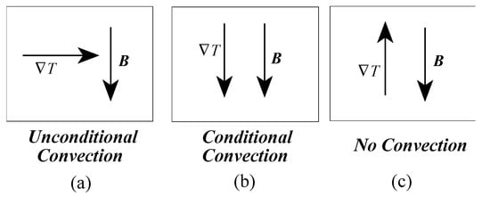 The effect of the relative orientation of the temperature gradient with respect to the body force on the setup of convection. (a) Unconditional convection; (b) conditional convection; (c) no convection.