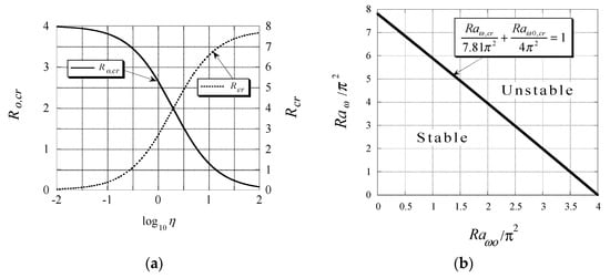 and is the wavenumber such that while the subscript in Equation (53) represents characteristic (neutral) values (values for which ). A singularity in the solution for , corresponding to the existence of a single root for , appears when . This singularity persists at higher orders as well. Resolving for the value of when this singularity occurs shows that it corresponds to negative values implying that the location of the rotation axis falls within the boundaries of the porous domain (or to the right side of the hot wall-a case of little interest due to its inherent unconditional stability). This particular case will be discussed later in this section. The critical values of the centrifugal Rayleigh number as obtained from the solution up to order 7 are presented graphically in Figure 5a in terms of both and as a function of the offset parameter . The results presented in Figure 5 are particularly useful in order to indicate the stability criterion for all positive values of . It can be observed from the figure that as the value of becomes small, i.e., for a porous layer far away from the axis of rotation, the critical centrifugal Rayleigh number approaches a limit value of . This corresponds to the critical Rayleigh number in a porous layer subject to gravity and heated from below. For high values of it is appropriate to use the other centrifugal Rayleigh number , instead of , by introducing the relationship (see Equations (49) and (54)) in order to establish and present the stability criterion. It is observed from Figure 5a that as the value of becomes large, i.e., for a porous layer close to the axis of rotation, the critical centrifugal Rayleigh number approaches a limit value of . This corresponds to the critical Rayleigh number for the problem of a rotating layer adjacent to the axis of rotation as presented by Vadasz [38]. The stability map on the plane is presented in Figure 5b, showing that the plane is divided between the stable and unstable zones by the straight line .