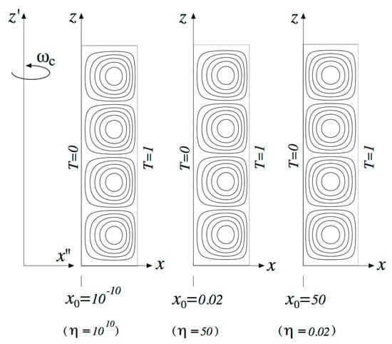 From Equation (50) it is observed that when the porous layer is far away from the axis of rotation then () and the contribution of the term is not significant, while for a layer close enough to the rotation axis () and the contribution of the first term becomes insignificant. In the first case the only controlling parameter is while in the latter case the only controlling parameter is . The flow boundary conditions are on the boundaries, where is a unit vector normal to the boundary. These conditions stipulate that all boundaries are rigid and therefore non-permeable to fluid flow. The thermal boundary conditions are: at , at and on all other walls representing the insulation condition on these walls. The governing equations accept a basic motionless conduction solution in the form