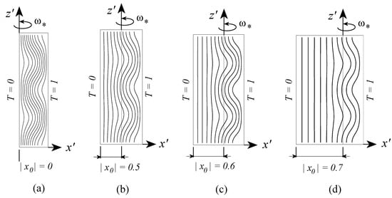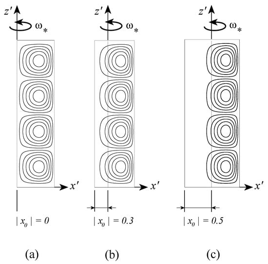 Two centrifugal Rayleigh numbers appear in Equation (48); the first one, representing the contribution of the offset distance from the rotation axis to the centrifugal buoyancy is , while the second, , represents the contribution of the horizontal location within the porous layer to the centrifugal buoyancy. The ratio between the two centrifugal Rayleigh numbers is dimensionless reciprocal distance from the axis of rotation