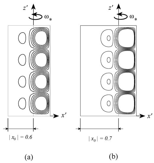The convective flow field at marginal stability for two different values of ; 10 streamlines equally divided between and . (a) streamlines for the axis of rotation located at ; (b) streamlines for the axis of rotation located at ; (Reprinted from [41], with permission from Elsevier Science Ltd).