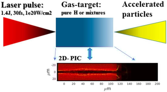 9] (points (i) and (ii) above) by investigating the role in proton acceleration played by a plasma mixture containing high mass number ions. In fact, since the heavier ions move slower than protons, they allow for the space charge effect at the plasma output to survive for longer times. This allows a longer acceleration time of the protons by the background plasma. The use of heavier atomic species in a gas-target introduces a new feature regarding the control of the acceleration of the lighter ions: i.e., the additional possibility of tuning the acceleration ratio by means of the density ratio of the species. This point will be discussed in the “modelling section” of this paper in which the results of 2D-PIC (Particle-In-Cell) simulations, meant as a simplified “virtual experiment”, are analyzed. The analysis will focus on the discussion of the two mechanisms identified above in a simplified setting, which privileges a fluid description (see