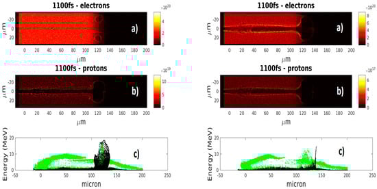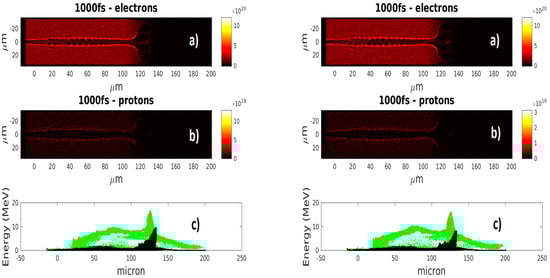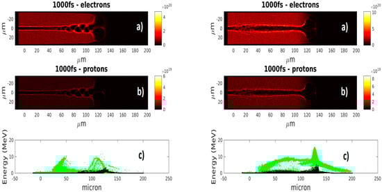3 (right). The frames (c) show the protons’ (black) and the electrons’ (green) energies versus the position along the axis of laser propagation. For both cases, the comparison shows energetic protons in the same region where density is decreasing and an increase of the proton energy as expected for the higher plasma density case, up to about 5 MeV maximum (at 1000 fs from the beginning of the interaction).