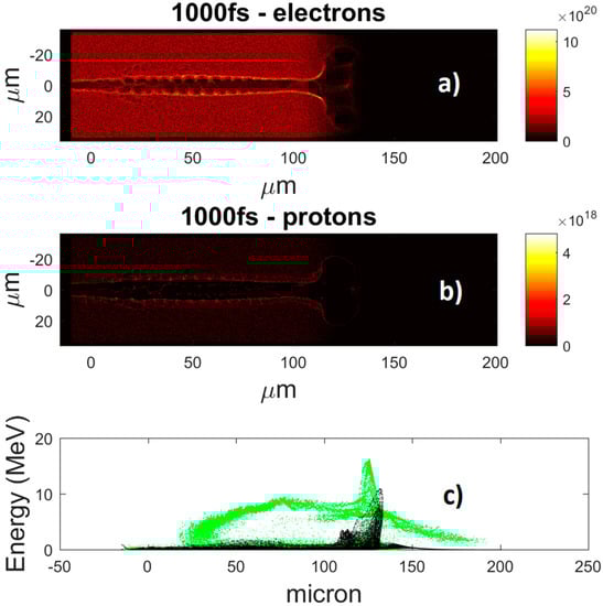 3 and the plasma profile considered is the same. The electrons’ (frame a) and protons’ (frame b) density distributions are shown with the protons’ (black) and electrons’ (green) energies versus the laser propagation direction (frame c). The proton energy reaches approximately the 10 MeV threshold at the plasma output, confirming that the simple use of higher mass number ions promotes the acceleration process with an energy increase of about a factor 2 (at 1 ps from the beginning of the interaction) when compared with the pure hydrogen case, still at the same electronic density and plasma profile.