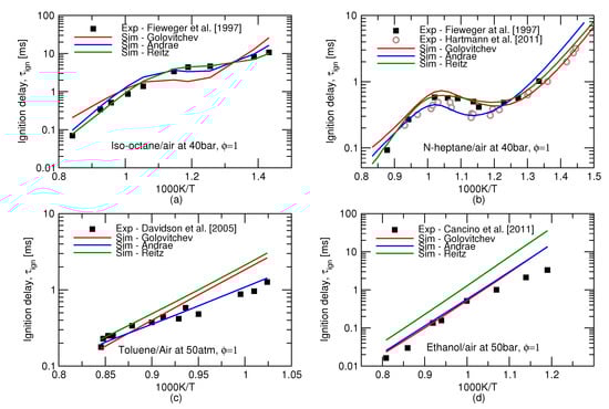 - Hartmann, M.; Gushterova, I.; Fikri, M.; Schulz, C.; Schießl, R.; Maas, U. Auto-ignition of toluene-doped n-heptane and iso-octane/air mixtures: High-pressure shock-tube experiments and kinetics modeling. Combust. Flame 2011, 158, 172–178. [Google Scholar] [CrossRef]