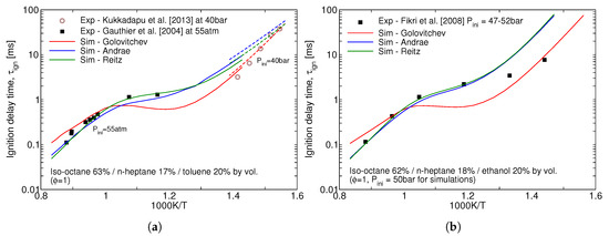 Predicted vs. measured ignition delay times of the (a) Gauthier TRF-A and (b) an ethanol-containing gasoline surrogate by Fikri et al. [14].