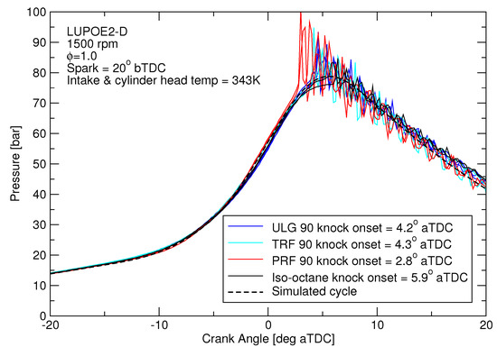 The knocking experimental cycles for the four different fuels which have pressures similar to the pre-knock pressure of ULG90.