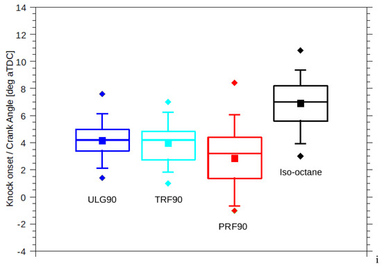 Statistical variation in measured knock onsets for 100 combustion cycles of the four fuels tested. Squares: mean knock onset, diamonds: earlier and latest knock onsets, box: 25/75 percentile, whiskers: 5/95 percentile.