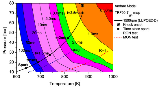 The relationship between the end gas thermodynamic state and the autoignitive tendency of a fuel can be depicted as ignition delay time () contours on a carpet plot as shown in Figure 5, Figure 6 and Figure 7.