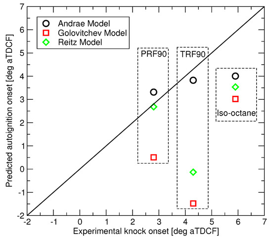 Autoignition predictions of the three RON 90 fuels have been made for the LUPOE2-D conditions of Figure 3 using the three reduced mechanisms and the comparison to the observed knock onsets is presented in Figure 8. The three fuels are subject to that same end gas and equivalence ratio history. Since LUPOE2-D was operated in skip firing mode, all trapped residual gases were expunged, hence an ideal scavenging was assumed in the modelling. Owing to this, the differences in the predicted autoignition times are caused solely by differences in the autoignition chemistry of the three fuels. Across the range of studied conditions, the Andrae’s model appears to perform consistently better than competitors, however more accurate PRF submodel in the Reitz model produces accurate autoignition prediction in the case of PRF90. Golovitchev’s model predicts shorter delays in contrast to what can be seen in the ignition delay time calculations at the constant pressure, see Figure 1.