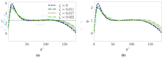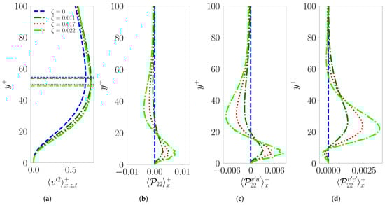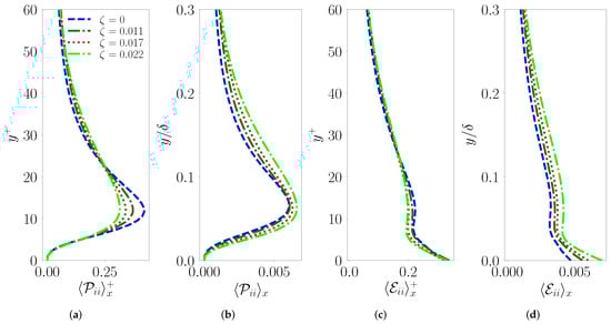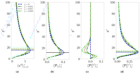 The effect on the streamwise velocity variance, is more complicated. Specifically, the inner-scaled streamwise variance, (and consequently, ) displays a distinct upward shift in the location of this peak value for increasing wave steepness. In addition, the normalized peak variance magnitude decreases with . Our analysis shows that even though surface-driven changes impact the various production terms ( and ) for , the overall variance production, , does not show an upward shift in the peak. Therefore, plausible mechanisms for generation of this upward shift still point to the vertical variance being modulated through the pressure–strain term.