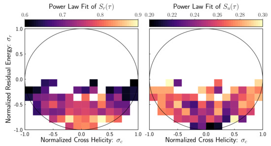 normalized cross helicity and the normalized residual energy defined by fluctuating quantities (i.e., ) of the velocity field , Alfvèn velocity and the Elsasser variables . We use 6 h for the Reynold’s decomposed fluctuations. This restricts the data () due to the geometry of the vectors [18]. In Figure 1, we provide a two-dimensional histogram of the 1158 6-h intervals conditioned on . We then take each individual 6-h interval and measure the structure functions: