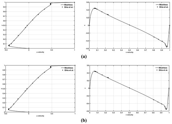 Velocity profiles along the vertical line passing through the geometric center of the cavity for u- velocity component (left) and horizontal line passing through the geometric center of the cavity for the v- velocity component (right) for (a) Re = 7500 and (b) Re = 10,000. The results we obtained in this study using our methods described in section Methods Governing Equations and Solution Procedure (indicated as “Meshless” in the velocity profiles) are compared with the results reported in Ghia et al. [42].