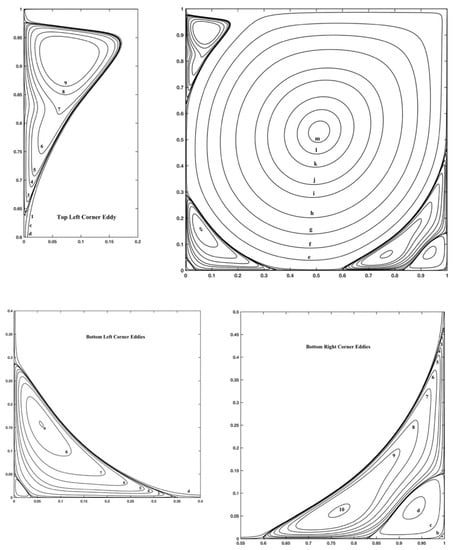 Figure 3, Figure 4 and Figure 5 show stream function and vorticity contours and demonstrate the formation of secondary vortices (Figure 3 and Figure 4) which appear as the Reynolds number increases. There are often used as qualitative results, to highlight the accuracy of the numerical method. In detail, Figure 3 shows the stream function contour plots for Re = 7500, while Figure 4 shows the stream function contour plots for Re = 10,000. Magnified views of the secondary vortices are also included. The stream function values for these contours are listed in Table 4.
