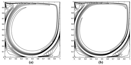 - Ghia, U.; Ghia, K.N.; Shin, C.T. High-Re solutions for incompressible flow using the Navier-Stokes equations and a multigrid method. J. Comput. Phys. 1982, 48, 387–411. [Google Scholar] [CrossRef]