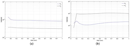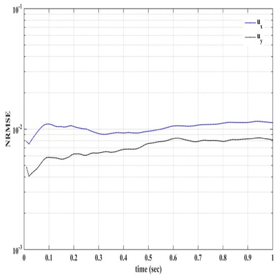 We further demonstrate the accuracy of the proposed scheme, by comparing our results with those computed using the finite element method (FEM). Flow equations were solved using the Incremental Pressure Correction Scheme (IPCS), which is an operator splitting method [53]. For the meshless solver, we use 353,617 nodes, generated using a triangular mesh generator, and we set the time step to s. For the finite element model, we solve the flow equations using the generated mesh and FEniCS (https://fenicsproject.org). We compute the Normalized Root Mean Square Error (NRMSE), as defined in Equation (43), for both velocity components (ux, uy), considering as gold standard the velocity field values calculated using FEniCS. Figure 18 shows the NRMSE for the velocity components for the time interval between t = 0 and t = 1 s.