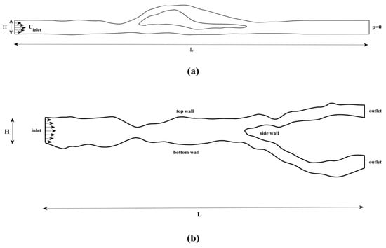 The length L is set to L = 0.12 and 0.041 m for the first (Figure 19a) and second (Figure 19b) flow domain, respectively. In both test cases, the height of the duct is set to H = 0.0041 m.