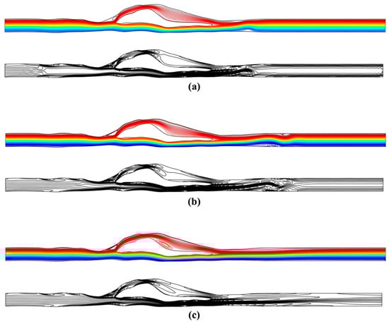 Stream function and vorticity contours for the bypass test case at (a) t = 0.5 s and (b) t = 1 s and (c) steady state.