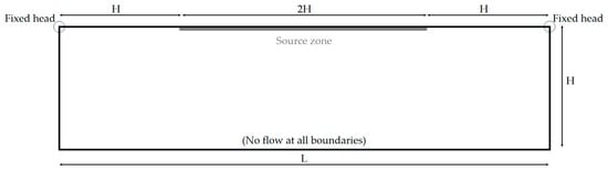 The domain and boundary conditions of the fractured Elder problem considered in this study are similar to the adapted Elder problem as used by Voss and Souza [17], Lu et al. [26] and Post and Prommer [23]. The domain was 600 m wide and 150 m high, as in Figure 1. All boundaries were impermeable to flow, and the top left and right corner nodes were two nodes with an imposed head. The middle part of the top surface had a constant concentration, which was sufficiently high to cause the onset of fingering instability. For all other boundaries, a no-flow boundary condition was assigned. The density contrast between the saltwater and the freshwater was equal to 200 kg/m3 as in Lu et al. [26] and Post and Prommer [23].