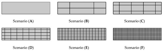 In this study, we investigated scenarios including networks of orthogonal fractures. Several scenarios dealing with different fracture density were considered (as shown in Figure 2). Scenario A corresponds to the homogeneous case. Increasing fracture density was considered in scenarios B to F.