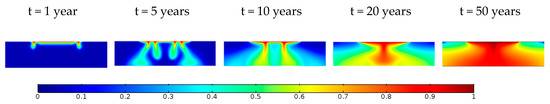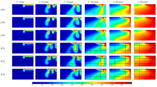 Solute distribution of half of domain of all the scenarios at simulation times of 1, 3, 5, 10, 20 and 50 years.
