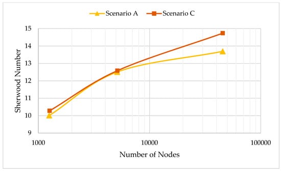 Variation of the average Sherwood number after three years (t = 3 years) versus the number of nodes used in the simulations (scenarios A and C).
