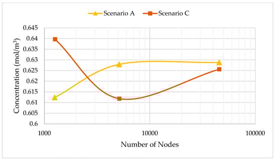 Variation of the time average concentration at a local point (x = 300 m; y = 0 m) versus the number of nodes used in the simulations (scenarios A and C).