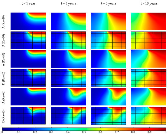 Solute distribution of half of the domain of scenarios (A) and (D) for different Rayleigh numbers at simulation times of 1, 3, 5 and 10 years.