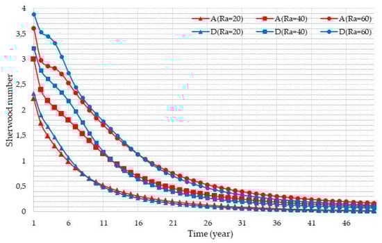 For the standard Elder problem, the critical value of the Rayleigh number for the onset of instability is [15]. The main goal of this section is to understand the effect of fractures on the onset of instability. Our objective is to understand if the fracture network will destabilize (means instability will appear with ) or stabilize (means instability will appear with ) the system. We developed simulations for the homogeneous case (scenario A) and for a selected fractured case (scenario D), for different values of Rayleigh number. For scenario (D), we set the aperture of . In each case of different Ra, the intrinsic permeability of the medium is constant ( (m2)); therefore, Ra would be changed by only modifying the diffusion coefficient. The values of the Rayleigh number for our simulations are 20, 40 and 60 which correspond to the diffusion coefficients equal to , and (m2 s−1) for both scenarios. The corresponding concentration distributions at times of 1, 3, 5 and 10 years are plotted in Figure 7. As one can observe, for = 40 and 60 at scenario (A), the initial appearance of fingers are obvious, which means we have an unstable system, and it confirms the fact that if Ra exceeds a value of 40, we would have the onset of instability the in homogeneous Elder problem. The results of scenario (D) show that the convective flow patterns of scenario (D) have higher strength of free convection than scenario (A). Figure 7 indicates that the onset of free convection in the fractured Elder problem is expected to occur with lower , and fracture porous media would destabilize this problem. This is consistent with the results of Simmons et al. [1] and Sharp et al. [41]. To confirm these results, Figure 8 shows the plot of the variation of the Sherwood number versus time, for all simulations. We can observe that the curve corresponding to scenario (A) at Ra = 20 is quite smooth, which indicates that there is no convection in this case and the solute flux is mainly diffusive. At Ra = 40, the curve for scenario (A) is perturbed with a prompt change between 2 and 3 years. The same behavior can be observed at Ra = 60, but the curve is perturbed between 1 and 6 years. This means that the perturbations represent the onset of instability. If we follow the same analysis for scenario (D), we can conclude that, in this case, the onset on instability occurs at a lower Rayleigh number as the curves are more perturbed than scenario (A). It is relevant to note that heterogeneity can become unstable, starting at a certain time but then stabilize the system at a later time. Figure 7, which gives the concentration distributions at local times, cannot be used to indicate if this phenomenon occurs in this case. However, it is clear from Figure 8 that this phenomenon does not exist as the perturbations of the Sherwood number appears once for all cases.