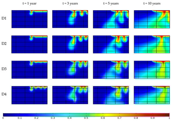 Solute distribution of half of domain of scenario (D) for different fracture aperture at simulation times of 1, 3, 5 and 10 years. The fracture aperture from D1 to D4 increases.