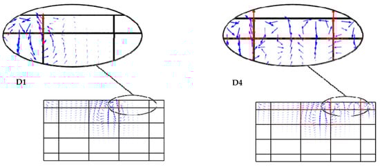 Velocity fields of cases D1 and D4 at simulation time of 1 year. Blue arrows and red arrows represent velocity vectors in porous matrix and fractures, respectively.